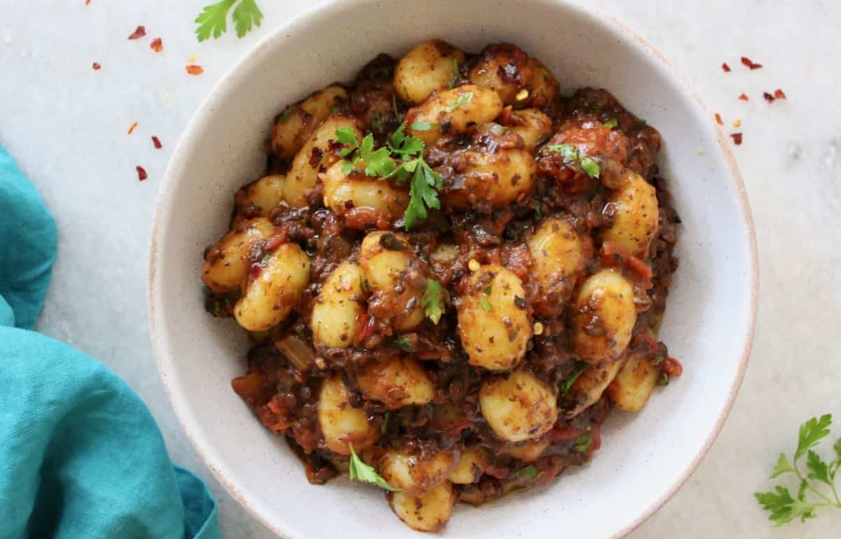 - Toss with gnocchi or wide noodles and serve with extra parsley and chili flakes on top. (The sauce is best the second day after the flavors have had a chance to marry overnight. Only combine with as much pasta as you plan on eating right away and remember to discard the bay, rosemary sprig and kombu if using).Pasta for serving: gnocchi or a flat noodle like pappardelle, fettuccine or tagliatelle.