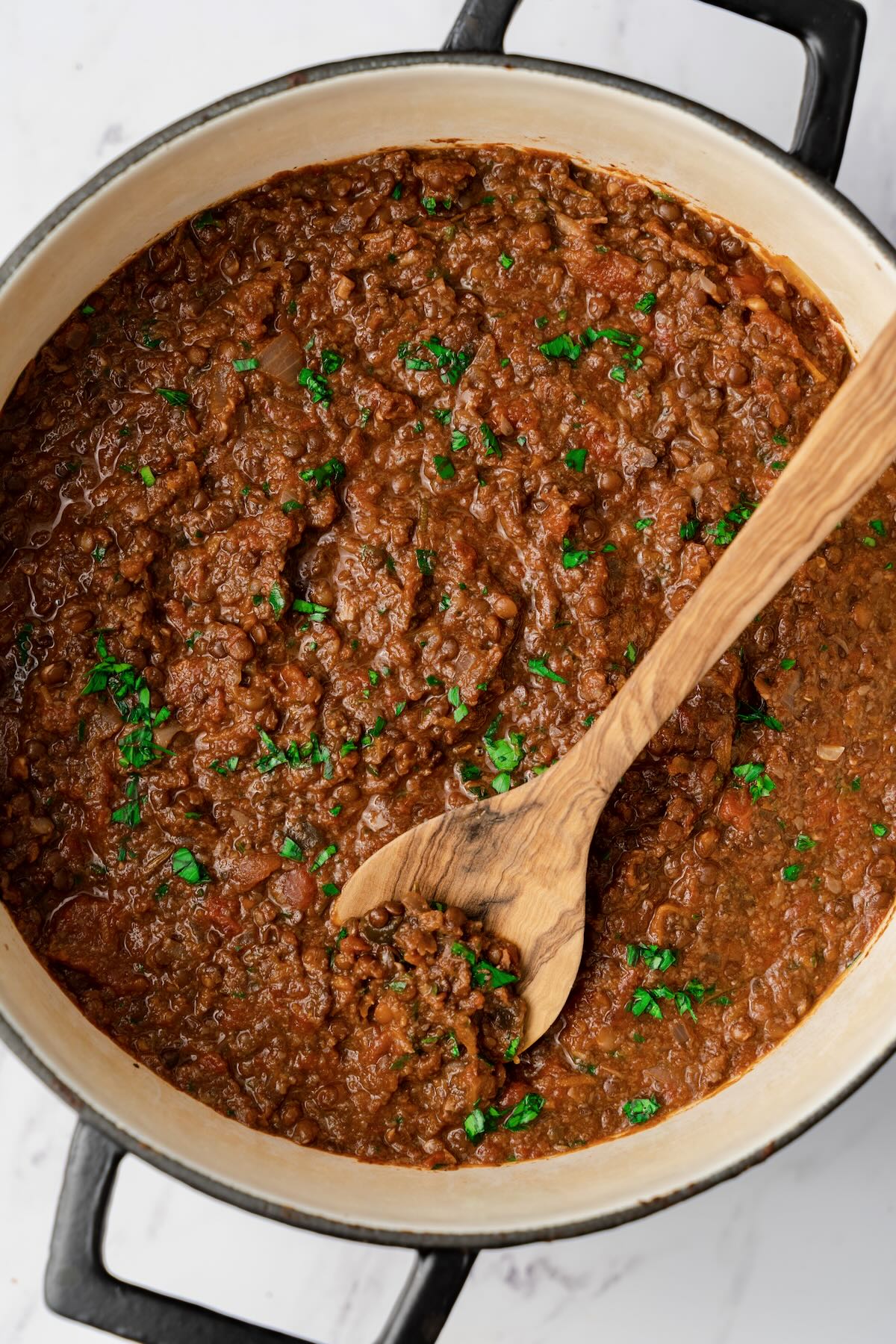 Black Beluga lentils are my choice for this ragu. They are a small type of lentil that get their name from their resemblance to Beluga caviar. I really love how they hold up to a long slow simmered sauce without turning into mush but becoming soft and buttery instead. Unlike their more earthy browns and green cousins, the black lentils have a more mild flavor profile that really picks up all the layers of flavor from the sauce without competing at all. All things considered, you can use pretty much any lentil you have in the pantry except for red ones, those will guaranteed turned into mush within 20 minutes and you don’t want to ruin this fabulous sauce. Puy lentils are a great option here as well, work with that you’ve got!