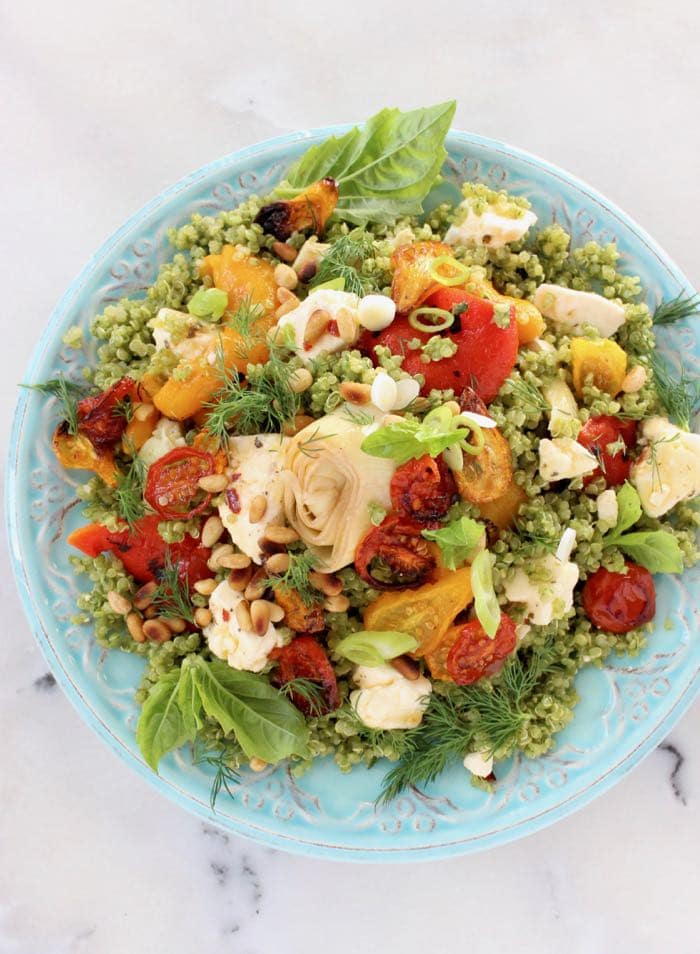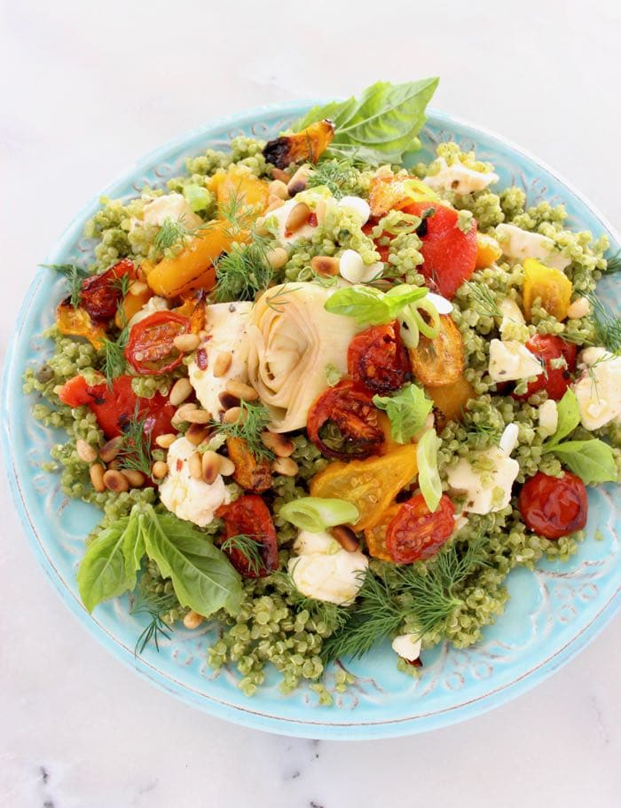 - Add the cooked quinoa and pesto to a large bowl. Toss to combine well then spoon it on a nice serving platter. Top with the marinated artichokes, feta cheese and roasted peppers. Sprinkle with the oven roasted tomatoes, capers and pine nuts. Garnish with the fresh dill, basil and scallions.