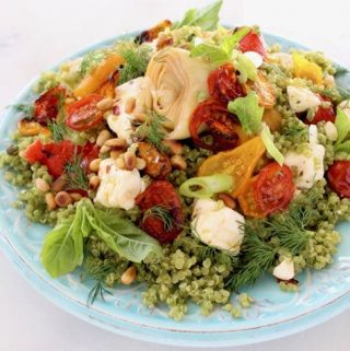 Lovely golden quinoa seeds dressed in a smooth fragrant basil Pesto. Then loaded with sweet oven roasted tomatoes, marinated artichokes, roasted peppers, feta cheese, fresh basil, dill and toasted buttery pine nuts.
