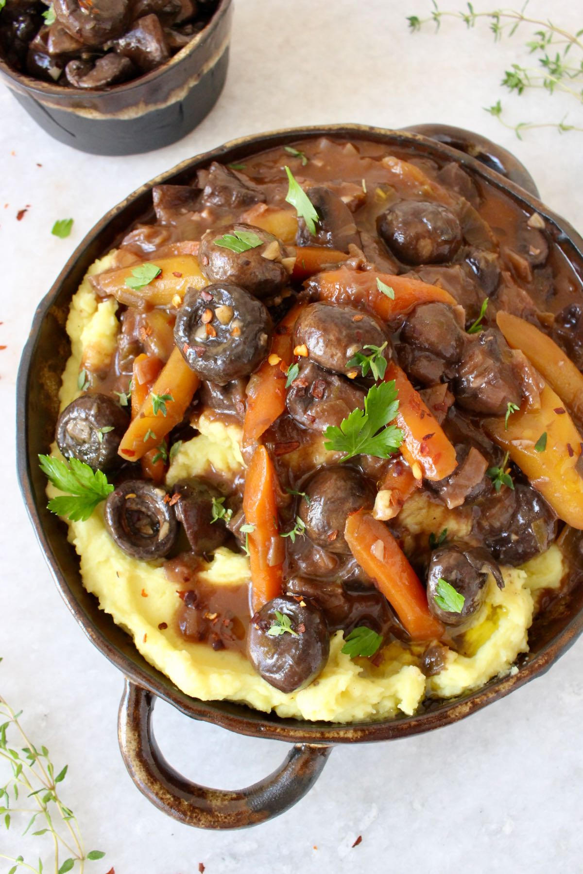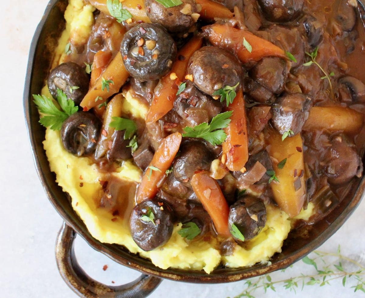 A divine Mushroom Stew recipe with red wine sauce ladled over fluffy mashed potatoes. Hearty and savory, easy to make, a healthy satisfying vegan stew a la Bourguignon just perfect for this cooler weather.