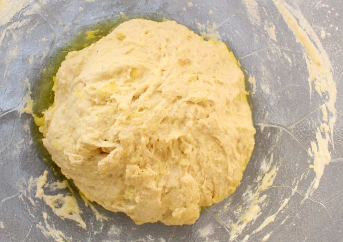 - To a large bowl add the flour, salt and mashed potatoes and give it a good mix. Add the water yeast mixture and combine with the flour until a shaggy sticky dough forms. Drizzle a little olive oil around the sides of the bowl to prevent sticking.2.5 cups all purpose flour, 1 cup mashed potatoes, Olive oil as needed, 1 tsp sea salt