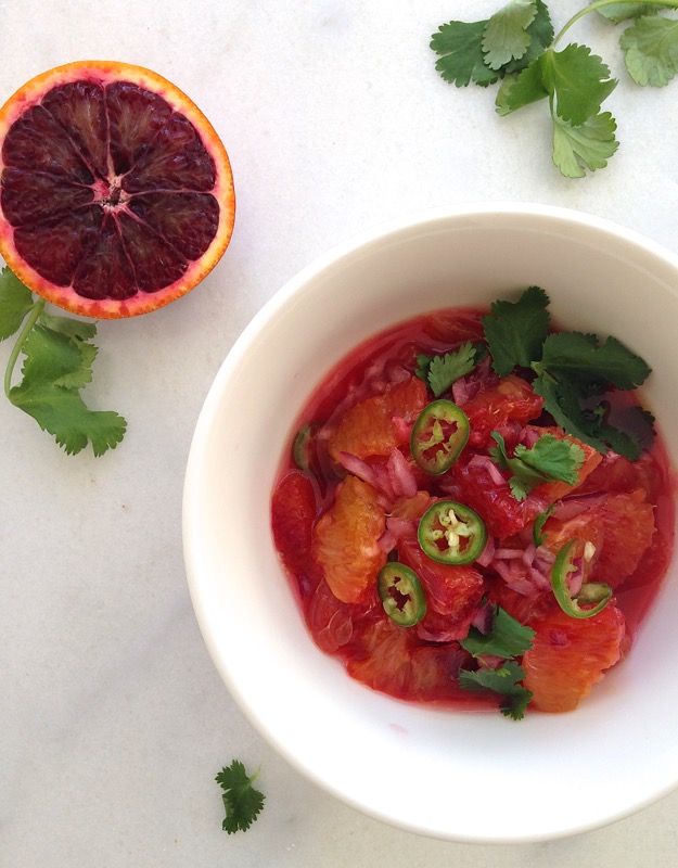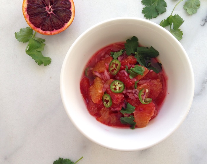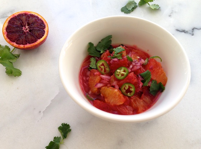 - Peel and cut the oranges into segments over a bowl, reserving all the juices. Gently combine the blood orange segments and juice with the onion, lemon juice, honey and sea salt in a bowl. Garnish with the cilantro and chile pepper and serve over grilled halibut fillets, chicken, or steaks.