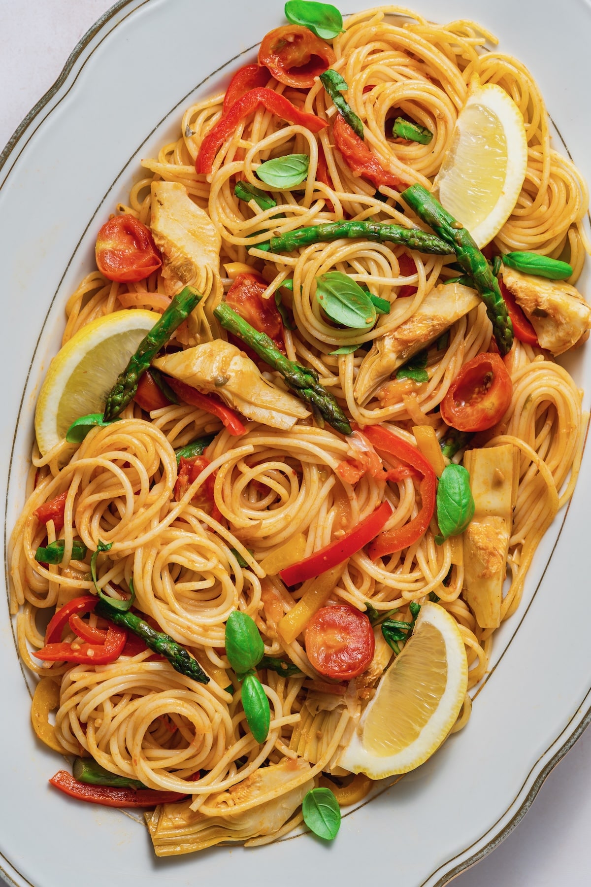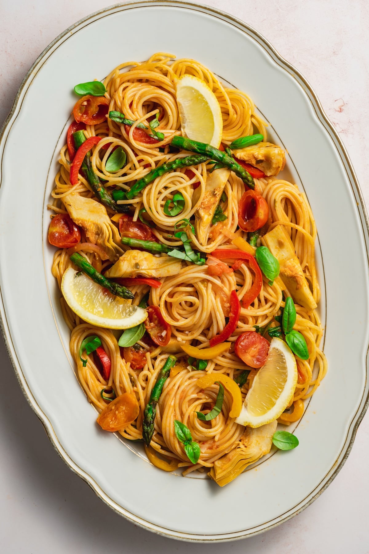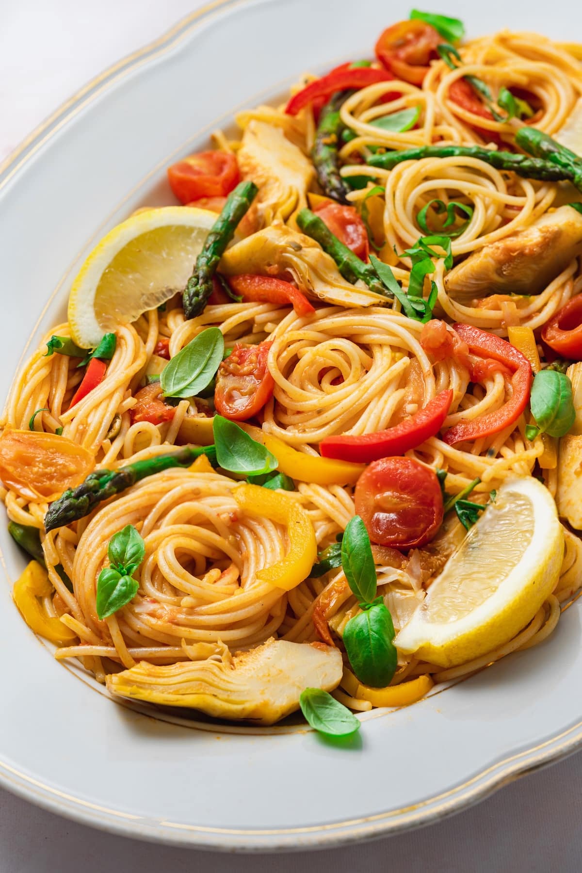 Looking to make the best Italian pasta primavera ? This easy spring veggie pasta recipe with tomatoes, lemon, asparagus and artichokes is what tasty dreams are made of. Enjoy hot or cold and wipe your bowls clean with a piece of our favorite focaccia bread.