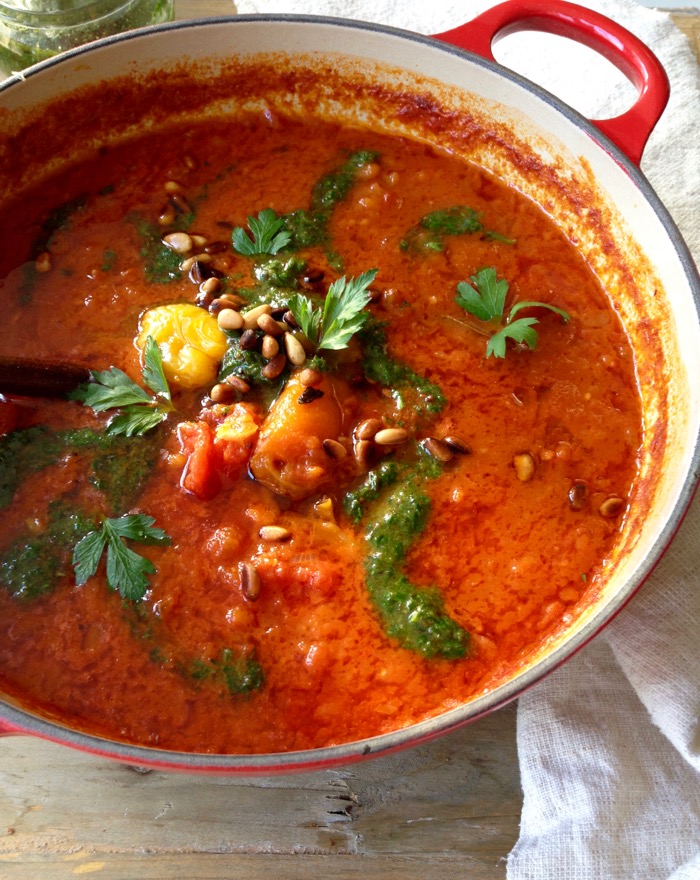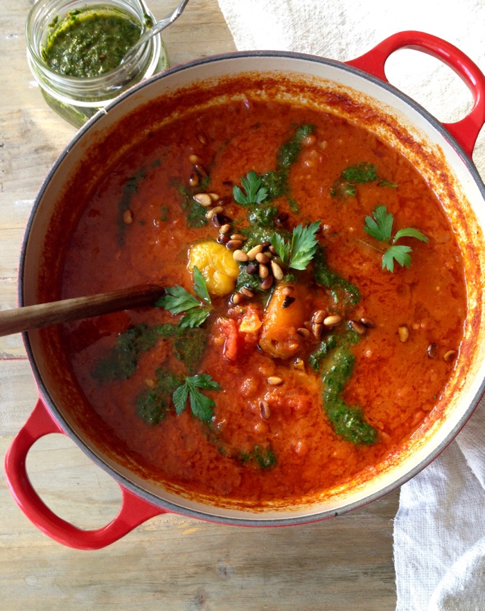 - Transfer the canned tomatoes to a bowl and using your hands crush them into rustic chunks and add them to the soup pot. Stir and pour in the water. Bring to a gentle simmer and partially cover with a lid. Allow the soup to cook gently for about 45 minutes until the flavors have married and desired consistency is achieved. Adjust seasonings to your taste with sea salt. Serve hot with the reserved pepper pieces and drizzles of pesto. Garnish with the toasted pine nuts, fresh parsley and basil.28 oz canned whole San Marzano tomatoes, 2 1/2 cups filtered water, 1/4 cup toasted pine nuts