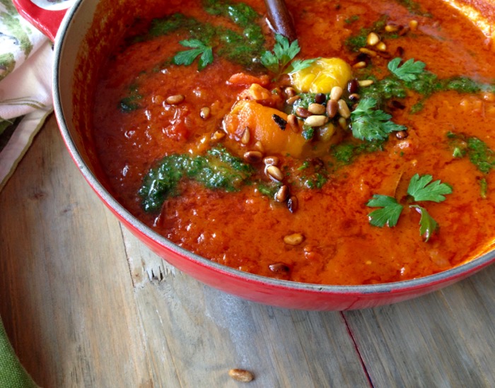 The best Italian roasted red pepper and tomato soup from scratch! Made with smoked paprika and finished with a luscious drizzle of parsley or basil pesto, then garnished with rustic chunks of roasted peppers and toasted pine nuts. An Irresistible recipe to add to your fall repertoire!