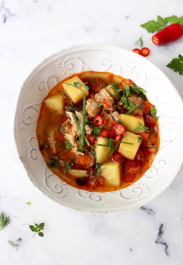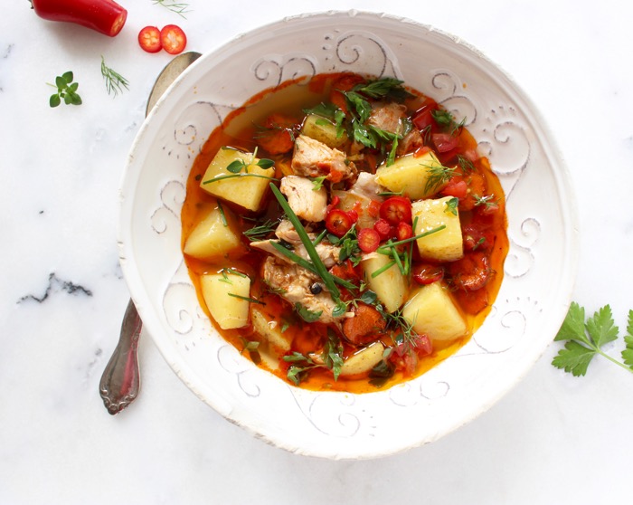 A good Spanish paprika is also essential to tie in with the bell pepper flavors and also makes for a beautiful colorful soup. And what is more comforting than chicken and potatoes right ? The classic way to a human’s heart I’d dare say.