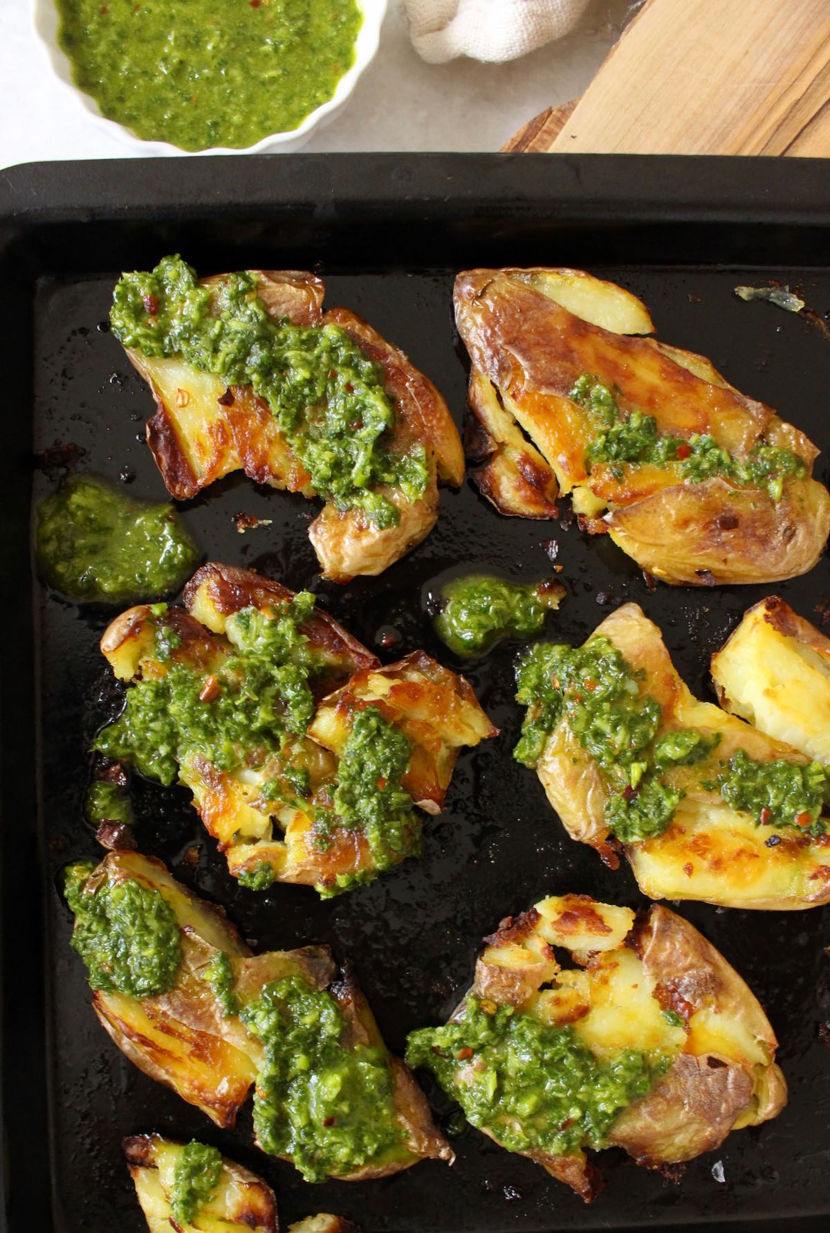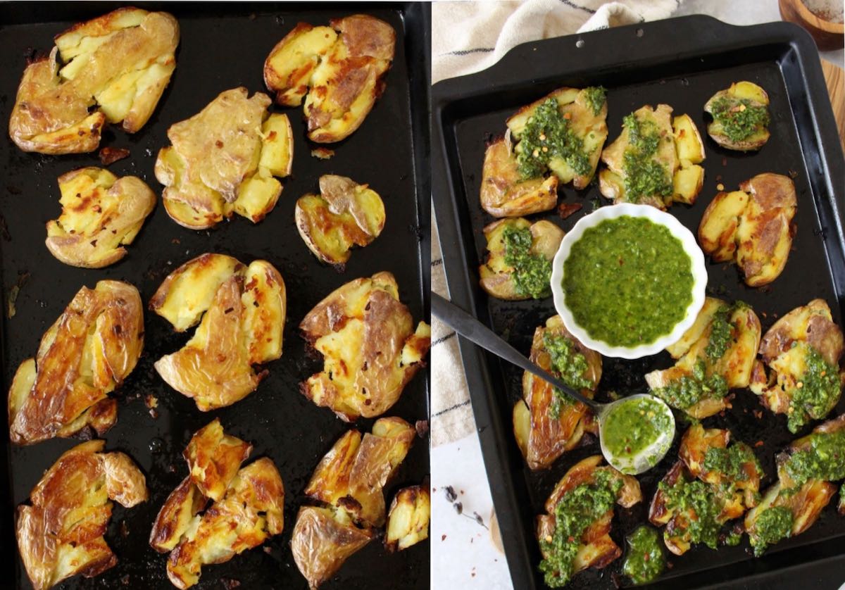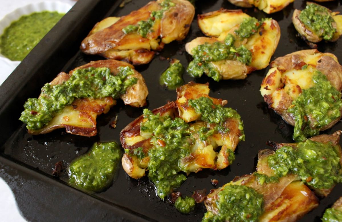 Boiled until tender then gently smashed and roasted coated in olive oil until perfectly crispy all around the edges where the flesh was exposed. As soon as they come out of the oven you want to generously douse them with a luscious garlicky sauce like basil pesto, chimichurri or a simple garlic infused olive oil.