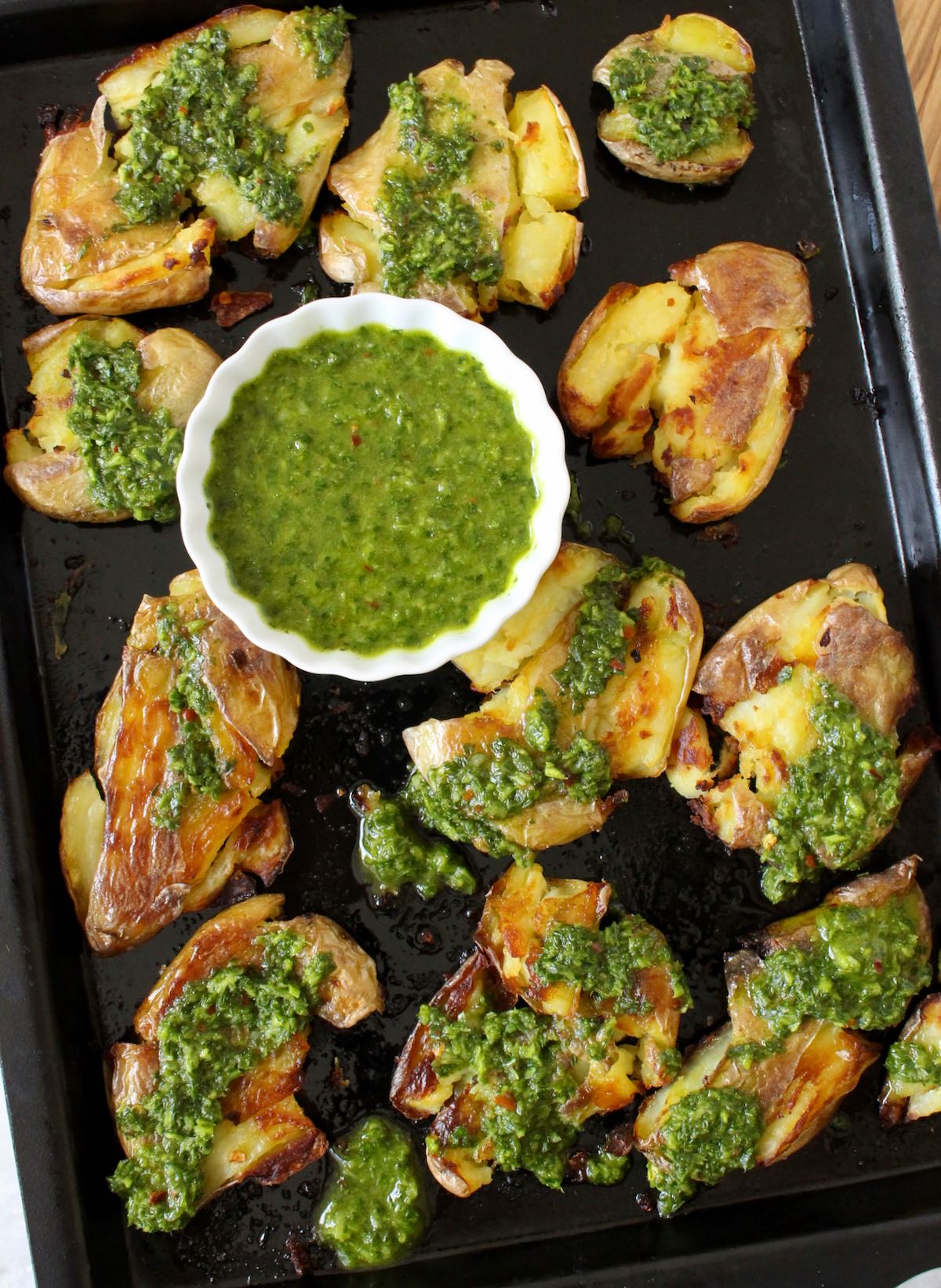 Crispy smashed fingerling potatoes recipe, oven baked then drizzled with a basil pesto or an Italian style parsley basil chimichurri sauce, heavy on the garlic and balanced by a fresh squeeze of zesty lemon.