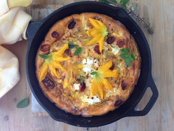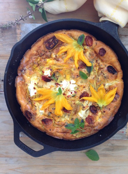 - Serve the frittata hot garnished with the remaining squash blossoms and the fresh basil leaves on top.