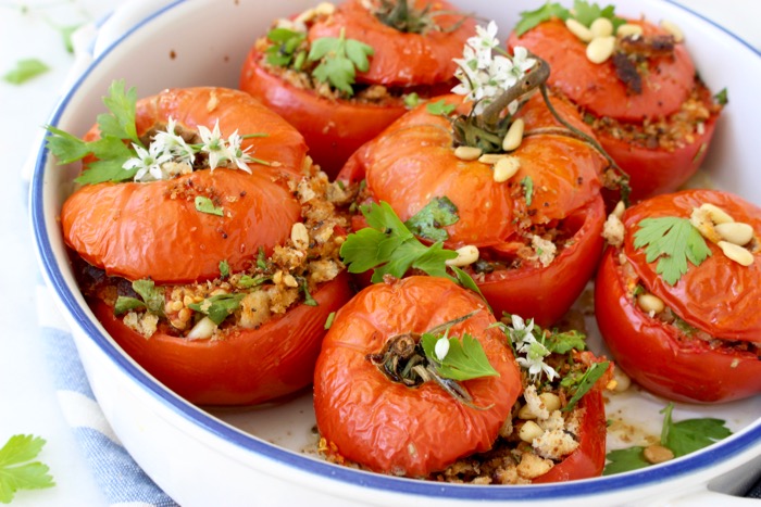 Stuffed Tomatoes or Pomodori alla Lucani, a lovely Italian dish from Basilicata made of baked sweet tomatoes stuffed with a toasted bread crumb and pine nuts mixture.