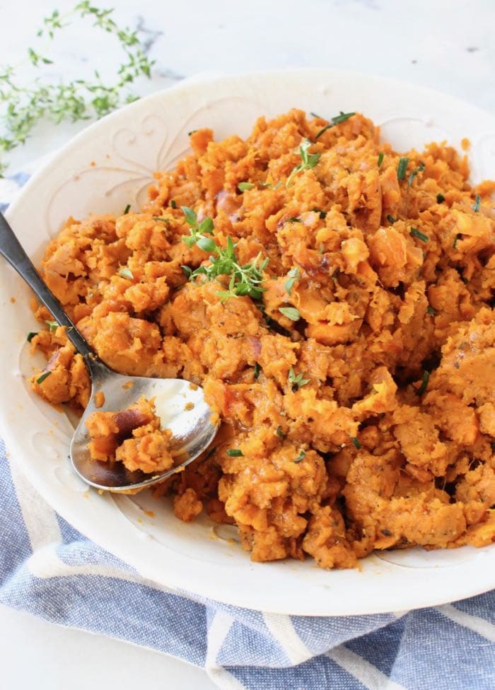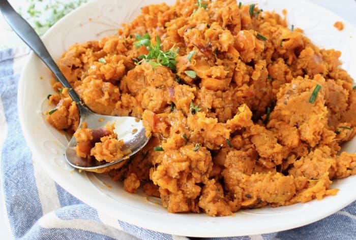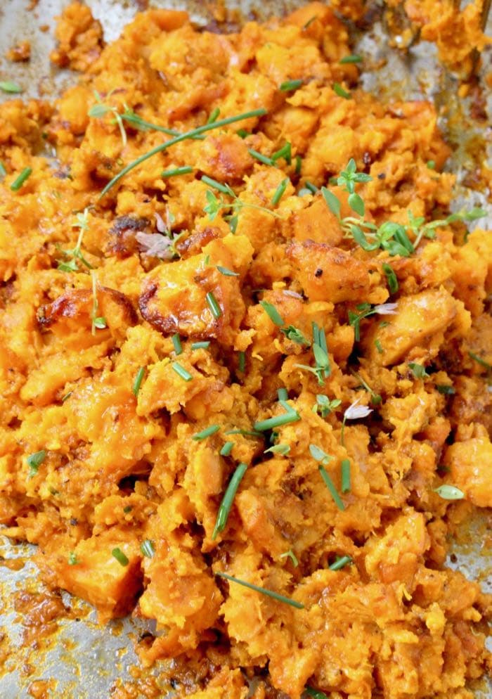 The best ever baked sweet potato mash recipe that is easy, healthy, savory and made from start to finish in one large roasting pan and garnished with fresh chives and thyme. You can keep it vegan and paleo by finishing the dish with olive oil instead of the silky herb butter suggested.