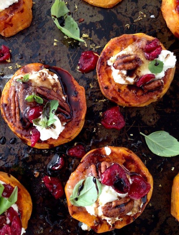 I had the creamiest, honey goat cheese in the fridge, so I crumbled some on my baked sweet potato rounds, whatever I had left of my Sicilian honey, a few candied walnuts or pecans for crunch, a handful of cranberries and a nice drizzle of balsamic glaze.
