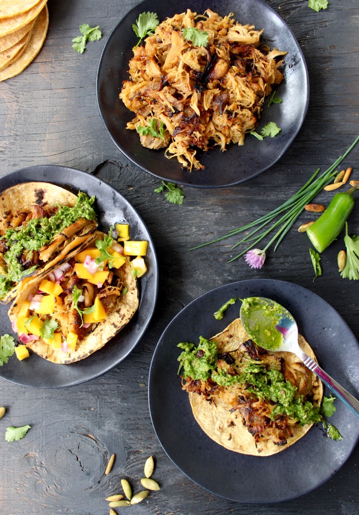 So when dinner time rolls around, all I need to do is throw my carnitas under the broiler for a few minutes, charr up the tortillas and maybe dice up some mangos for an easy fruity salsa. I love adding a little touch of fruit on top, it works really beautifully with these carnitas tacos but totally optional. The chive pesto is exquisite by itself.