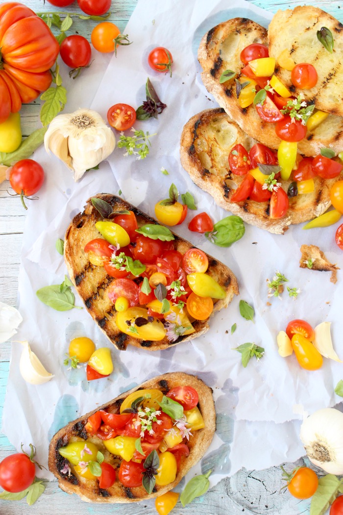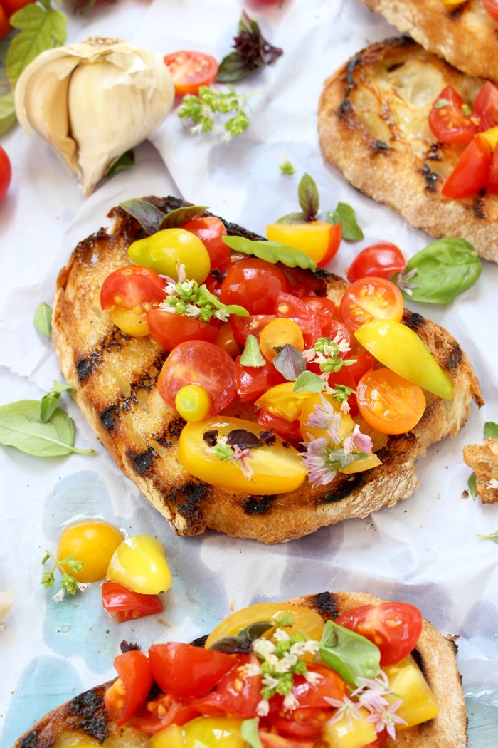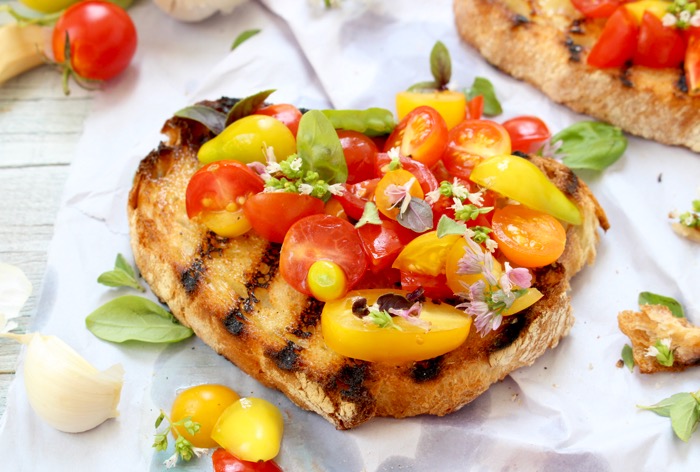The secret to success lies in using the freshest ingredients, but also in grilling the bread. That is the fundamental difference between making Bruschetta and toast. One is grilled and permeated by a lovely smokiness, the other one is toasted. So different textures and flavor profile.