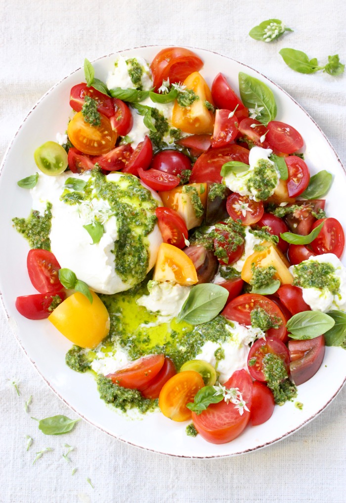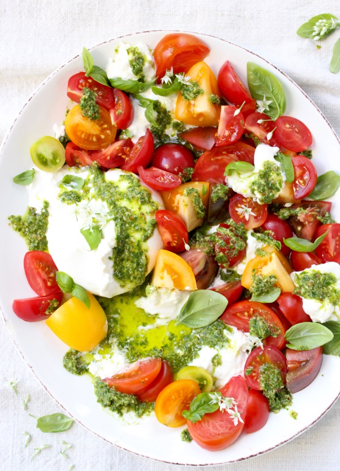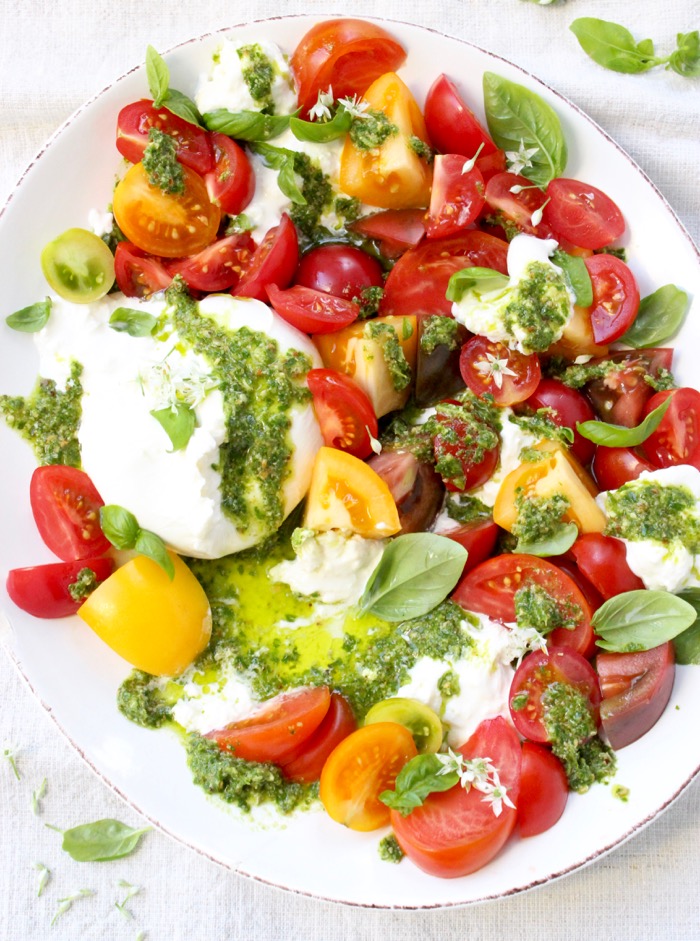 So you naturally reach for the finest soft cheese on the planet, right? And you make a tomato burrata salad served over fresh basil pesto, like a boss!