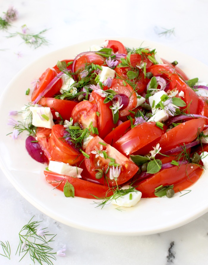 Fresh tomato onion salad with the best of summer’s juicy heirloom tomatoes, capers and fresh herbs dressed in a lovely olive oil and red wine vinegar dressing. Enjoy with crumbles of dairy free feta cheese or mozzarella + a slice of crusty bread or bruschetta to mop up all those juices.