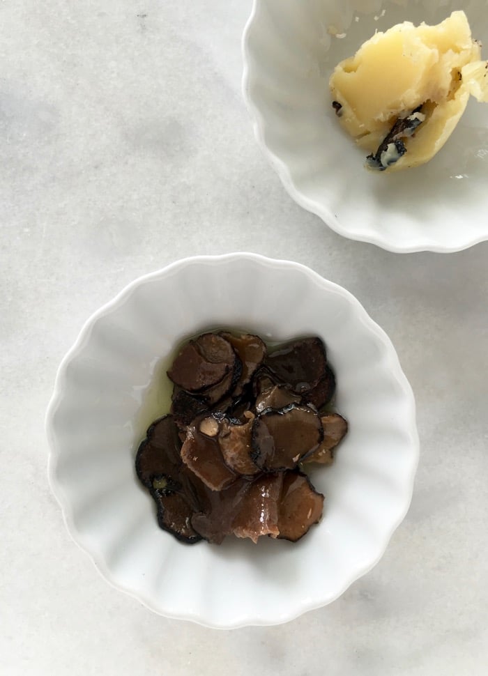 I used the next best thing that I store in my refrigerator at all times: truffle butter + a jar of truffle carpaccio (<–amazon affiliate), simply thinly sliced truffles in olive oil.
