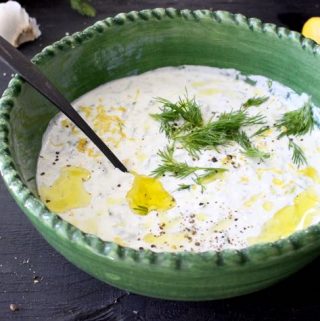 A healthy, creamy, authentic Greek yogurt Tzatziki sauce recipe, made with garlic and cucumber, the perfect condiment for grilled chicken, gyros, burgers or as a dip with pita chips at a summer garden party. No sour cream ever!