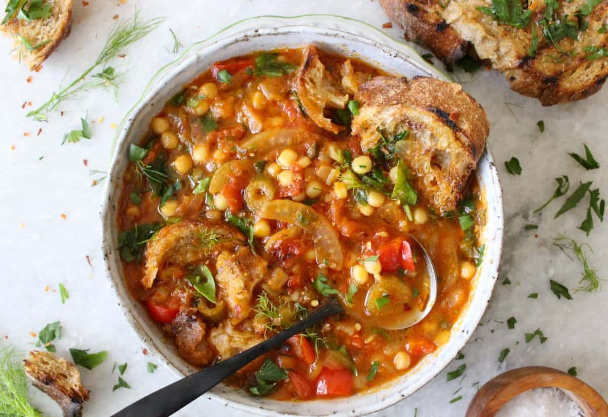 This easy classic Italian soup captures all the sweet fragrant flavors of Italian fennel sausage but without any of the meat, saturated fat and cholesterol. It’s vegan, meatless, dairy free (pure vegetarian recipe) and filled with nutrients. Usually served as primo piatto (between starter and main course), I personally love my Minestra to be the main course enjoyed ribollita style: with torn pieces of extra garlicky bruschetta floating on top.