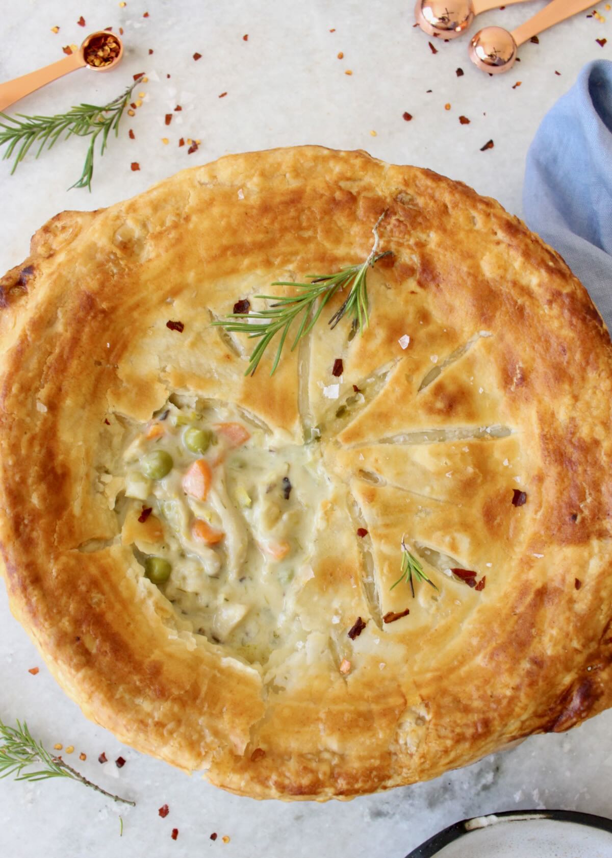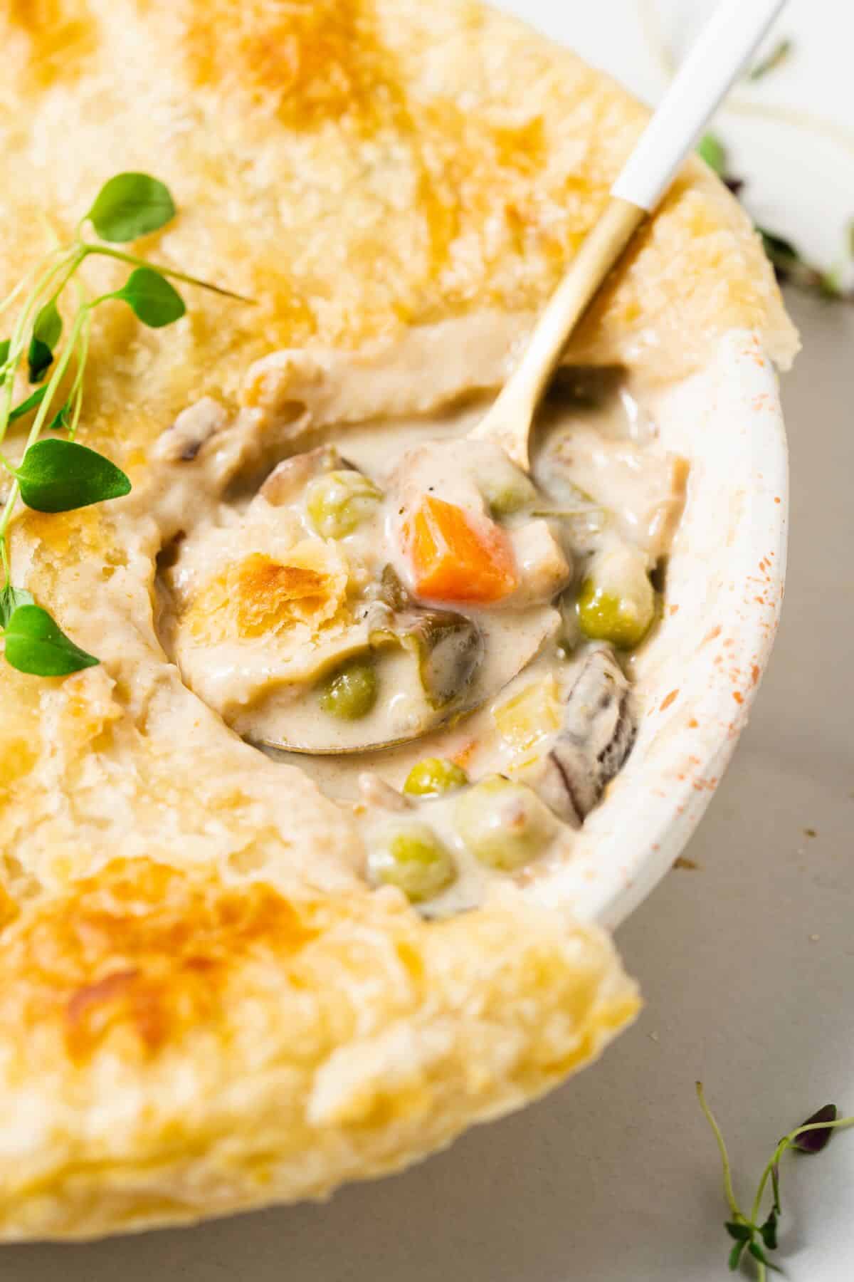 - Can I use potatoes in the pot pie filling instead of peas? – You sure can if you prefer. Make sure to use golden waxy potatoes diced very small and simmer until al dente in the filling before transferring to the oven for the final bake.