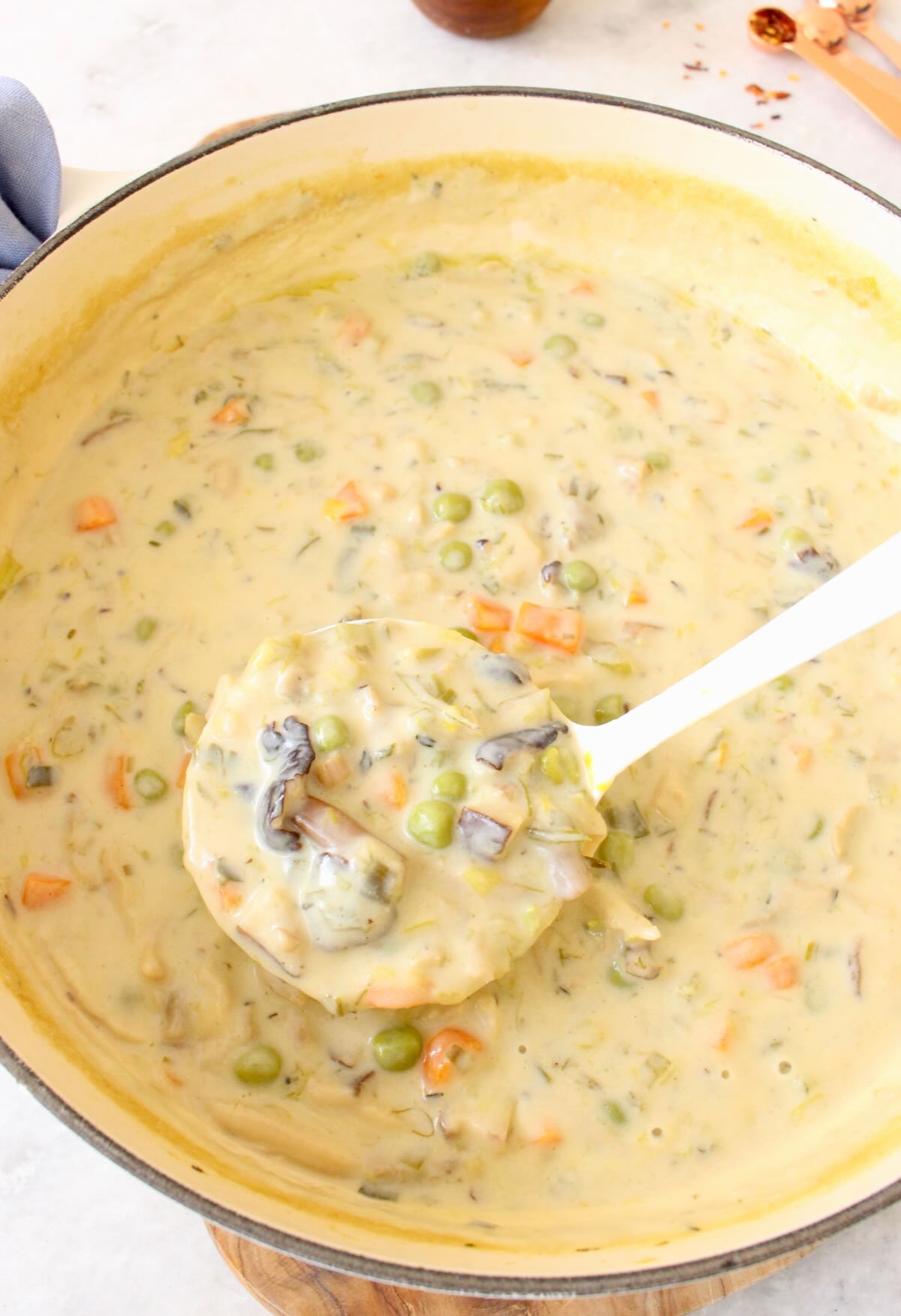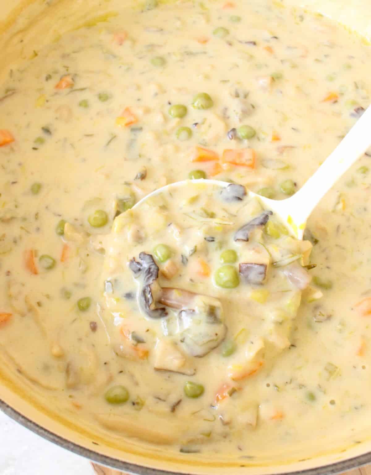 It’s silky and creamy and so delicious you can really just serve it a pot pie soup or veggie stew. Simply thickened with a small amount of light whole wheat pastry flour and finished with a fatto in casa / homemade dairy free cashew cream. A healthy blender luscious cream that really elevates this dish, plus it can be enjoyed guilt-free without any of the cholesterol and saturated fat from dairy.