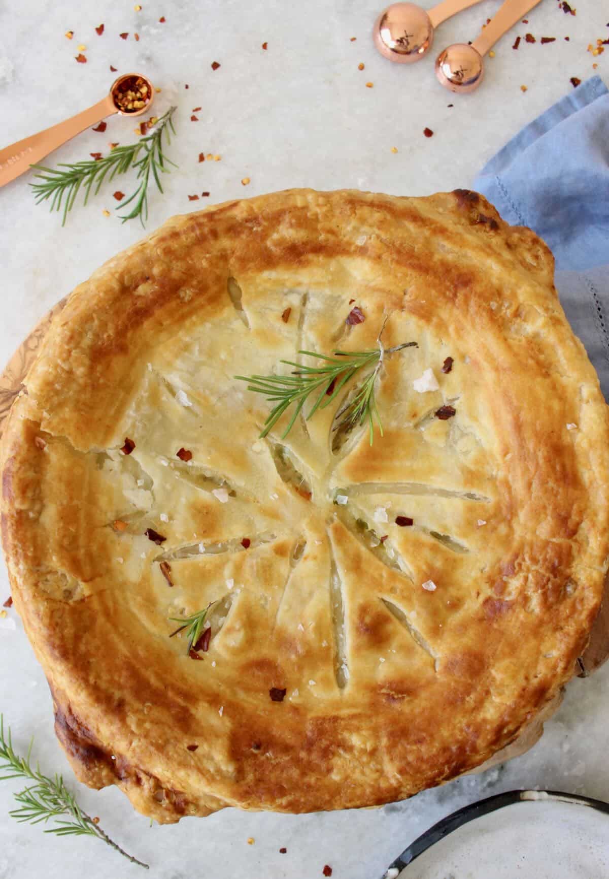There are a few ways to bake this pie. I used an 8 X 2.5 inch deep round casserole dish to serve as a centerpiece for Thanksgiving. You could use two shallow pie dishes in which case you will need 2 x 7 oz puff pastry sheets to cover both. Alternatively you could also bake it in 6 individual ramekins. If you wish to have more flaky dough to go around you could even bake the pie in a lasagna pan. For this scenario I like to cut round pieces of the dough with a biscuit cutter and cover the top of the filling. Whatever you fancy!