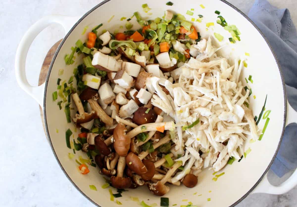 - Prep the Mushrooms: Depending on which type of mushrooms you are using you’ll want to give them all a quick rinse. I diced the shiitake caps and tore the oyster clusters into bite size pieces. The King Oyster mushrooms shred beautifully with the help of a fork and create a nice texture throughout the filling. If using Chanterelles then you can just shred them by hand into thin strips, leaving the small bite size ones intact.1 lb wild mushrooms