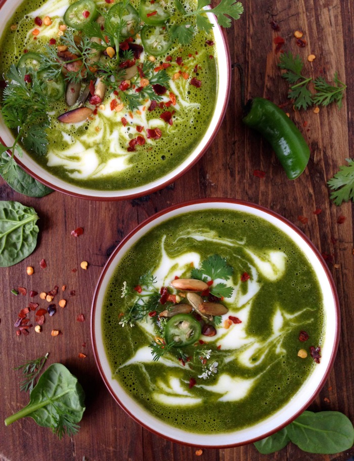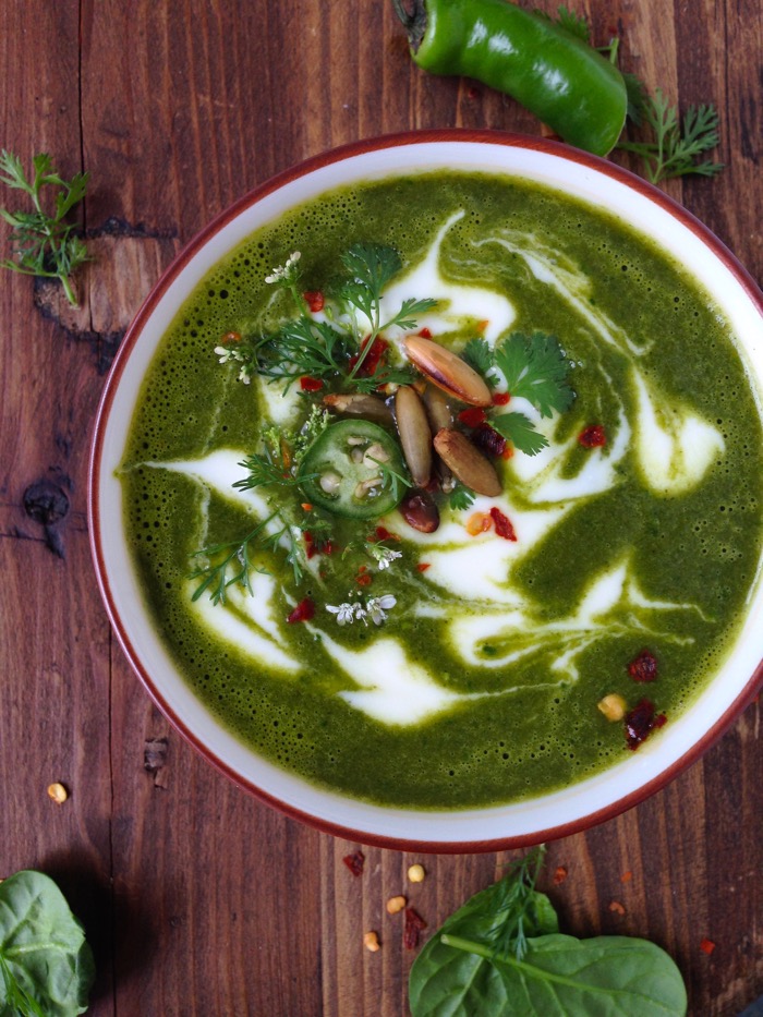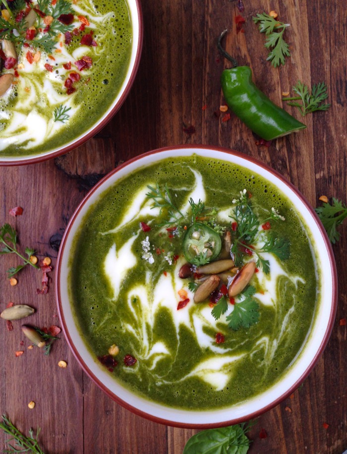 Supernatural spinach, kale, a zucchini for body and texture, together with a bunch of herbs and a little kick from green chili peppers make this soup simply perfect!