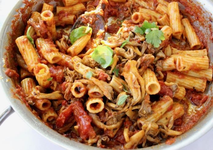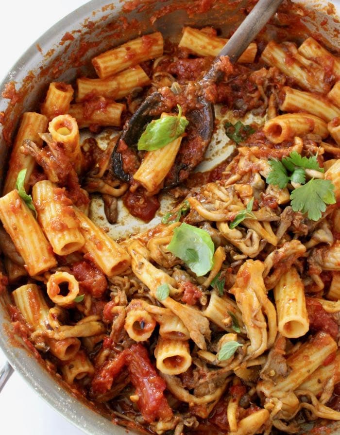 - Drain the pasta and toss with the sauce. Serve with the fresh herbs and reserved Mushrooms on top.