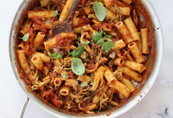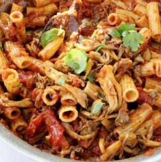 The smoky layers of flavor in this dish are reminiscent of a traditional homemade, slow cooked meat sauce from Bologna, but it is 100% vegan and plant based. Easy and healthy, toss it with your favorite whole wheat pasta, fettuccine, rigatoni or bucatini for a perfect weeknight dinner.