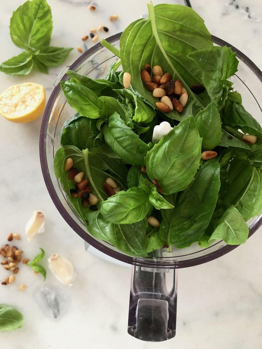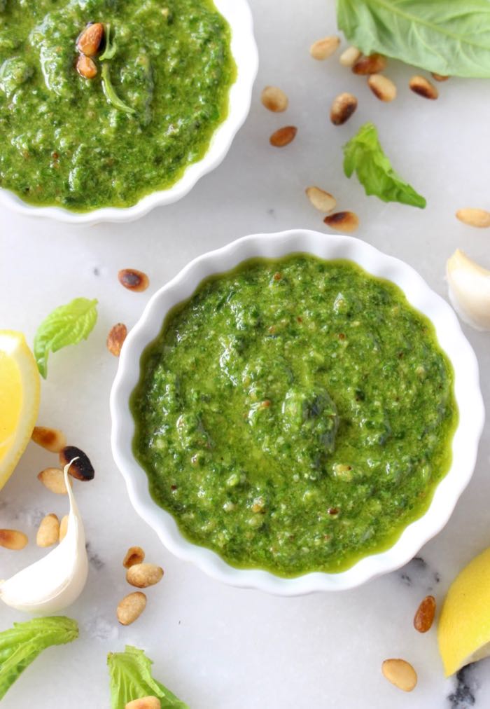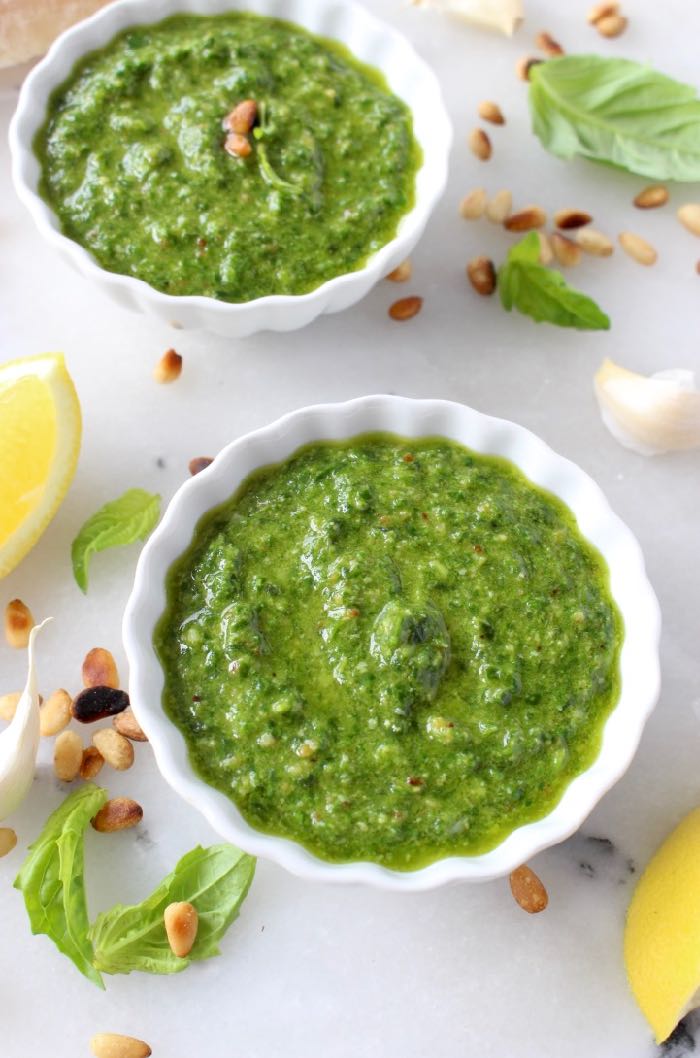 - Lemon – a fresh squeeze of lemon juice balances out the flavor of the pesto but also helps prevent oxidation so the basil won’t turn brown.