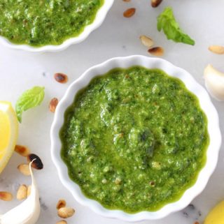 A classic Italian basil walnut pesto sauce consisting of a rustic basil leaf puree, garlic, extra virgin olive oil and traditionally pine nuts. Though I mostly like to use walnuts or pine nuts, it can also be made with hazelnuts, pecans and even almonds. The perfect summer sauce for pasta, panini, pizza or to dress a tomato salad.