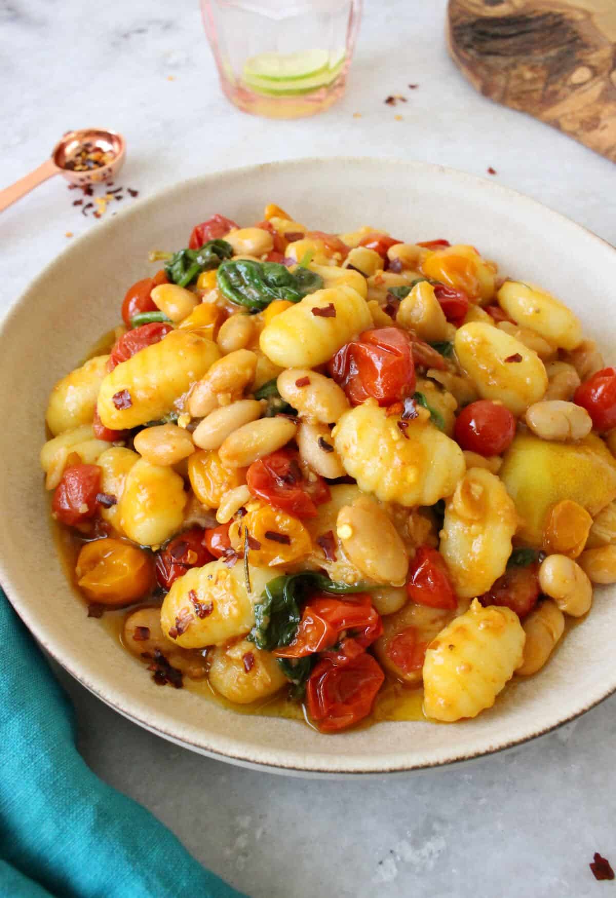 Creamy cannellini beans swim in the most luscious roasted tomato pasta sauce infused with mild notes of garlic and rosemary before being tossed with fluffy potato gnocchi. Think of it as a simple Tuscan pasta recipe to be made with the last of summer’s heavenly tomatoes and baby spinach.