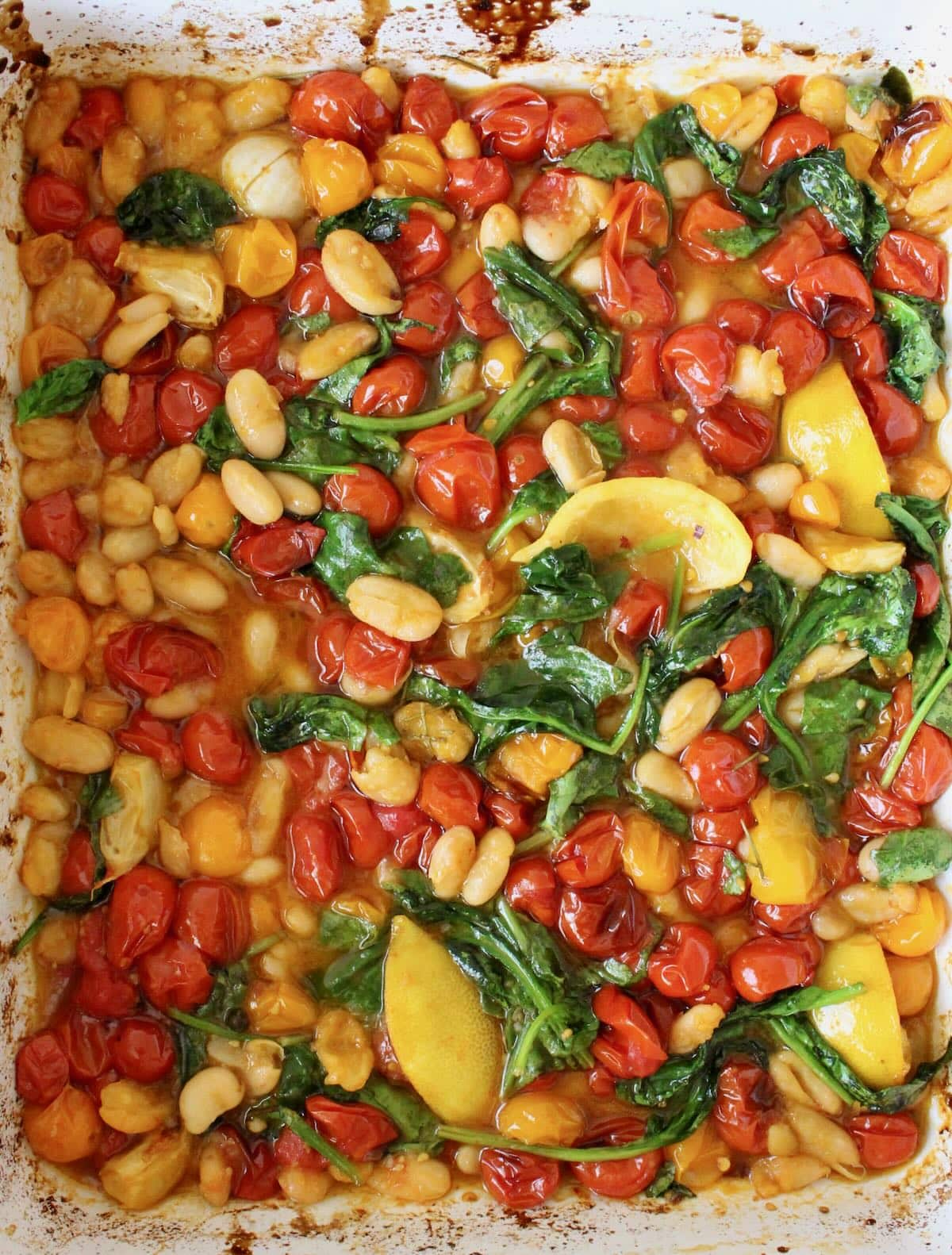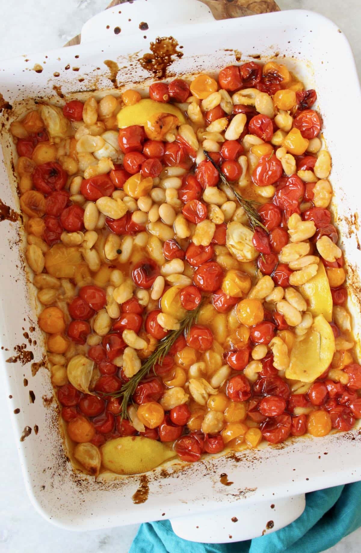 Roasted tomato pasta with white cannellini beans featuring sweet and juicy cherry tomatoes roasted with garlic, herbs and lemon until they burst into the most delicious sauce. Toss with fluffy gnocchi or your favorite pasta for the perfect meatless dinner.