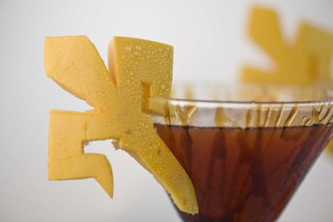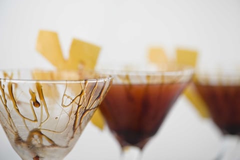 Take the martini glass out of the freezer and drizzle the Balsamic Glaze. Next, take the fleur de lis and hang it on the martini glass. Pour your drink…..!!