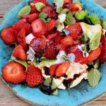 Use your hands and tear the burrata pouch. Place on a plate and top with the sliced strawberries.
