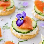 top with a slice of cucumber, a piece of smoked salmon and sprinkle with the chopped fresh herbs. Garnish with edible flowers and freshly cracked black pepper if desired!