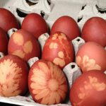For the marbled eggs design, wrap each egg in a few yellow onion skins, then wrap tightly in a nylon stalking. Boil in yellow onion dye following the above instructions, only just using yellow onion skins.