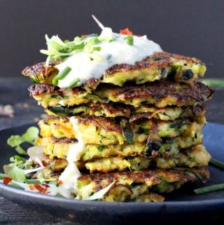 Easy and healthy zucchini patties, cakes, fritters or Cucuzze in Calabrian dialect, whatever you wanna call them really, made with shredded zucchini, panko bread crumbs, scallions and tzatziki sauce, then quickly crisped up in a hot cast iron skillet. Like crab cakes but without any crab!