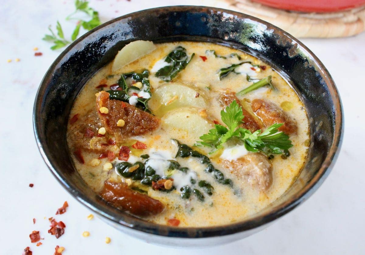 Creamy Vegetarian Zuppa Toscana soup recipe with crispy beyond Italian sausage and kale. A favorite American creation, the most popular copycat soup from the Olive Garden restaurant. It simply translates as "Tuscan soup" and not an authentic Italian soup like a ribollita is.