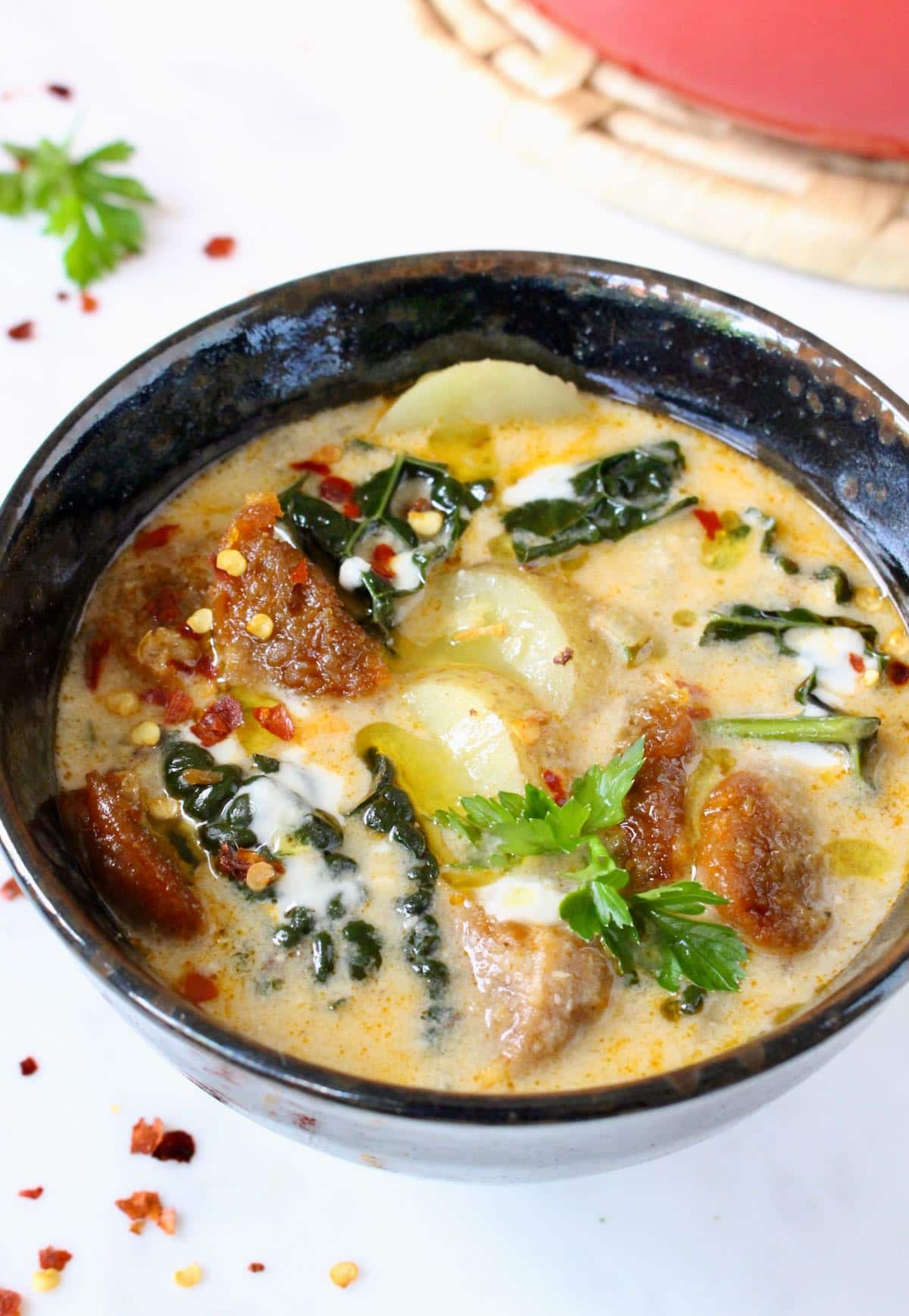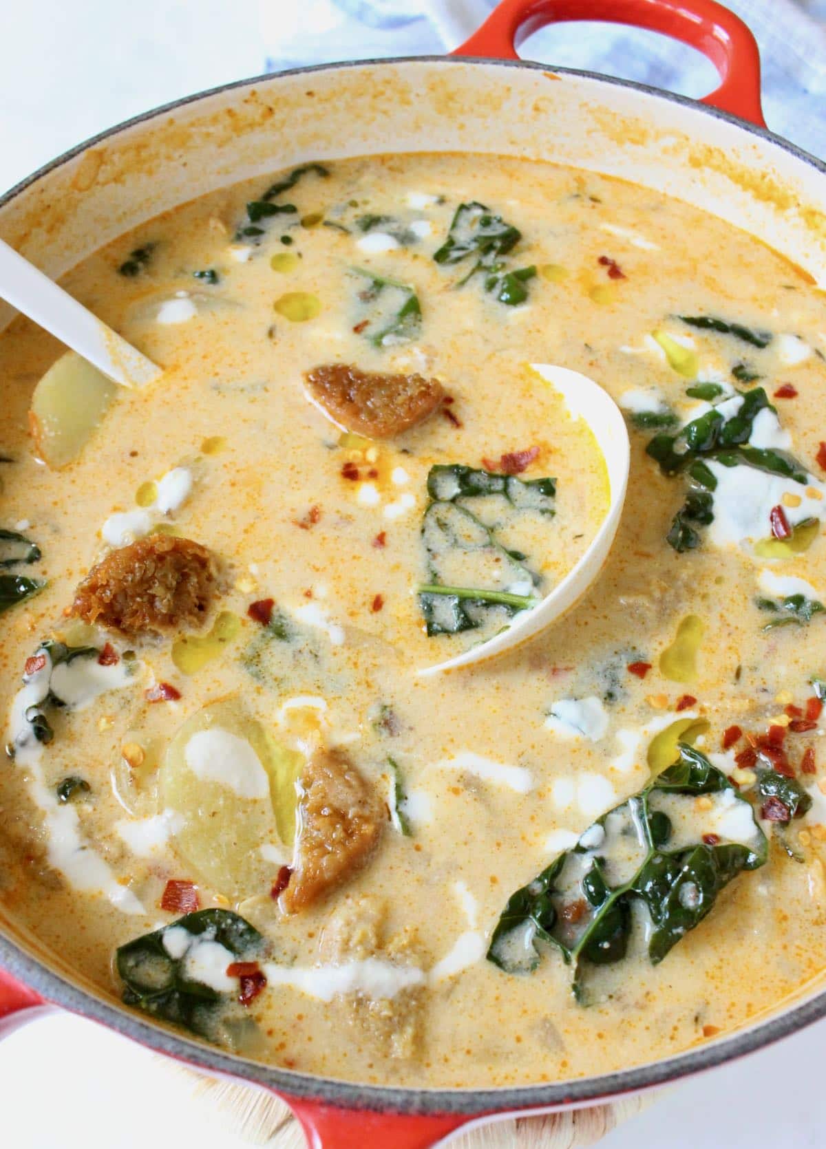 - Italian sausage – avoid all that cholesterol and go clean with a vegetarian plant based Italian sausage like Beyond Meat. The flavor is absolutely perfect, just a little spicy so you might want to add a pinch of chili flakes for extra heat. To keep it nice and crispy it’s important to reserve the crumbled sausage after browning and add it back into the soup when serving. Don’t cook it with the potatoes and cream as it will become soggy.