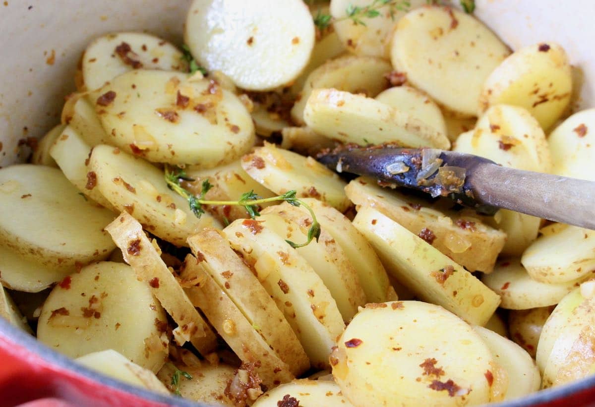 - Potatoes – thinly sliced Yukon gold potatoes work best here. Their thin skins avoid the need for peeling and the waxy texture holds up nice during the cooking process. Red skinned potatoes or baby fingerlings cut in half lengthwise are a nice alternative if you’d prefer to use those.
